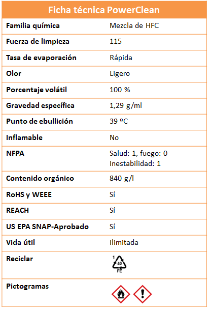 Diseñado para ahorrar tiempo y dinero, el limpiador de flux PowerClean seca rápidamente, no es inflamable y no deja residuos blancos. También es un líquido limpiador eficaz para limpiar conectores y eliminar óxidos ligeros al mismo tiempo que previene los residuos blancos. Puede afectar al poliestireno y policarbonatos. Pruebe antes de usar en plásticos. No apto para uso en sistemas de limpieza con calefacción.